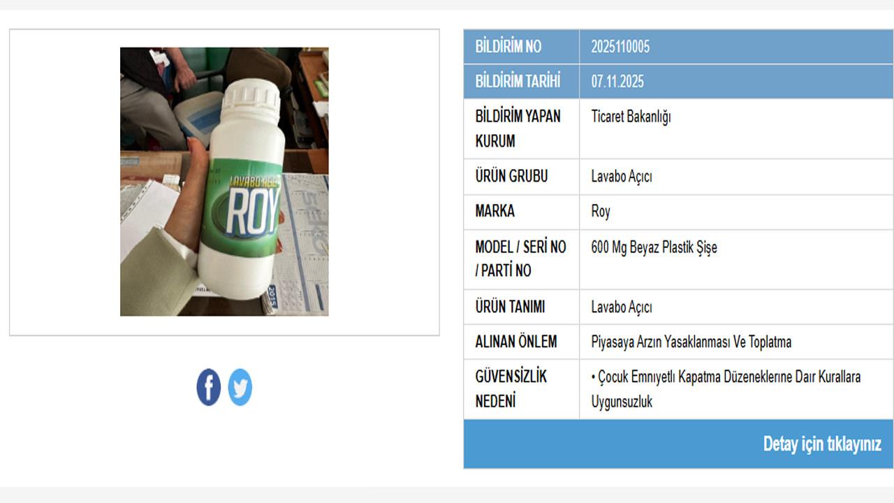Ticaret Bakanlığı, piyasadaki bazı temizlik ürünlerini incelediği denetimler esnasında önemli bir güvenlik sorununu ortaya çıkardı. Roy isimli markanın lavabo açıcısı ile Meltem isimli markanın kostik lavabo açıcısının piyasaya arzı yasaklandı ve toplatma kararı alındı.