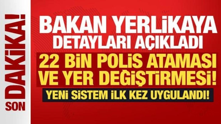 Bakan Yerlikaya, "2025 yılı genel atama döneminde ilk kez hayata geçirdiğimiz sistemle; Birinci Bölgeden İkinci Bölgeye 7 bin 983, İkinci Bölgeden Birinci Bölgeye 12 bin 355, İkinci Bölgeden yine İkinci Bölgeye 1.707 olmak üzere toplam 22 bin 45 polisimizin, atama ve yer değiştirme işlemlerini gerçekleştiriyoruz" dedi.