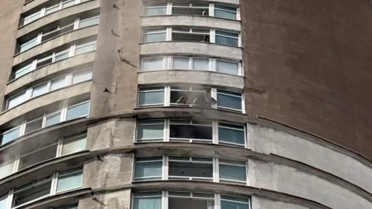 Yangın nedeniyle oluşan duman binayı sararken, üst katlarda bulunan kişiler pencerelere yöneldi.