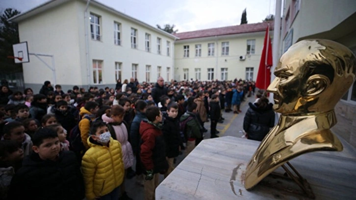 Türk bayrağı ile şehitler için bir dakikalık saygı duruşunda bulunan öğrenciler, ardından İstiklal Marşı’nı okudu.