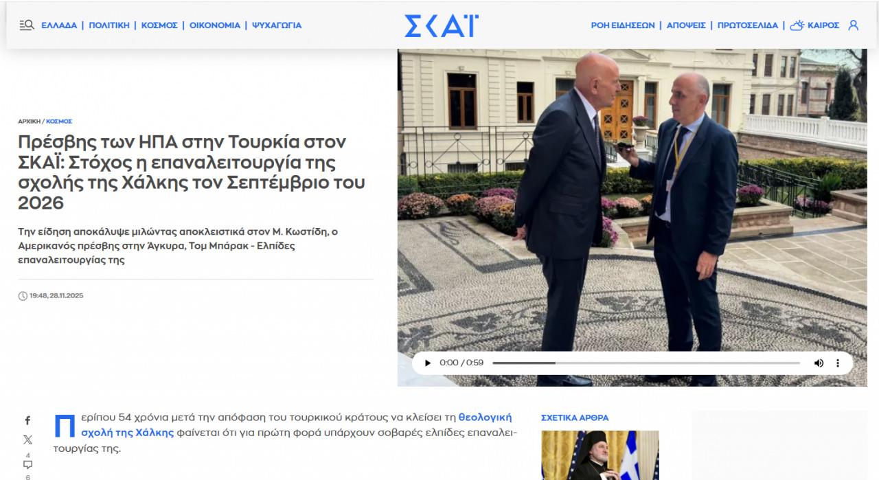 Yunan SKAI televizyonuna konuşan Barrack, "Papa, Amerika'yı ziyaret edip Oval Ofis'te Başkan'la görüştüğünde; hem Başkan Trump hem de Cumhurbaşkanı Erdoğan için büyük önem taşıyan Halki İlahiyat Okulu (Heybeliada Ruhban Okulu) konusunu gündeme getirdi. Bu nedenle, süreci takip etmek, tartışmaları kolaylaştırmak, hızlandırmak ve desteklemek için yapabileceğimiz bir şey olup olmadığını görmek istedik. Amaç, okulun Eylül 2026'da yeniden faaliyete geçmesini sağlamak." dedi.