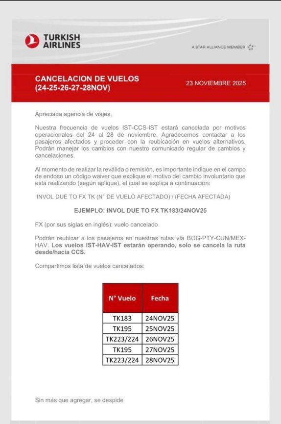 Türk Hava Yolları (THY), İstanbul–Caracas (IST–CCS) hattındaki uçuşlarını 24–28 Kasım 2025 tarihleri arasında operasyonel nedenlerle geçici olarak durdurdu.
