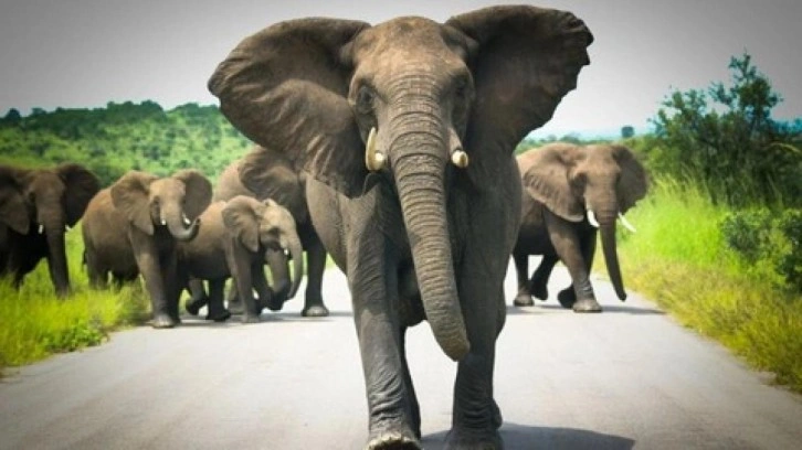 FİLLER YOLDAN UZAKTA BESLENİYORDU