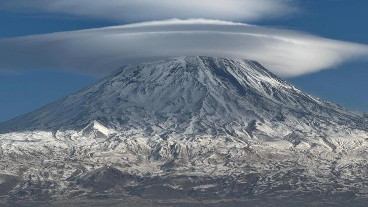 Son günlerde etkili olan soğuk hava ve kar yağışıyla birlikte tamamen beyaza bürünen Ağrı Dağı’nın üst kısımlarını, mercek şeklindeki bulutlar çevreledi. Geniş bir alanı kaplayan bu özel bulutlar, dağın karla kaplı manzarasıyla birleşerek görenleri büyülüyor.