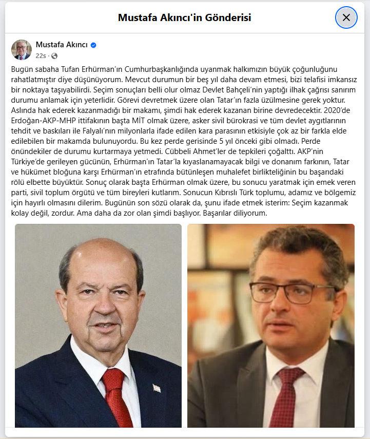 2020'deki cumhurbaşkanlığı seçimlerinde Ankara'nın seçim sürecine doğrudan müdahale ettiğini iddia eden Akıncı, "Erdoğan-AKP-MHP ittifakının başta MİT olmak üzere tüm devlet aygıtlarının tehdit ve baskıları ile Falyalı'nın milyonlarla ifade edilen kara parasının etkisiyle çok az bir farkla elde edilebilen bir makamda bulunuyordu." diye yazdı.