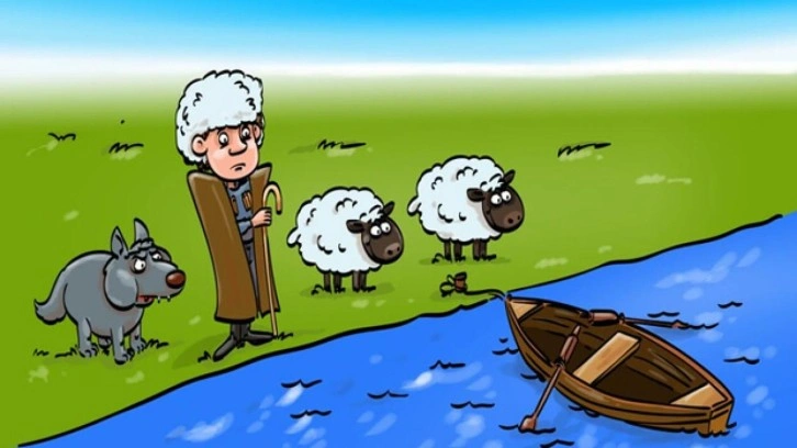 Yukarıda yer alan görselde genç bir çoban, bir kurt ve 2 koyun görüyorsunuz. Bu ekip bir nehir kenarına gelir ve nehirde tek seferse sadece 2 kişiyi taşıyabilecek bir küçük tekne bulurlar. Peki, genç adam ne yapmalı? Kurt ile koyunu yalnız bırakmadan tüm herkesi nasıl nehrin karşısına geçirecek?