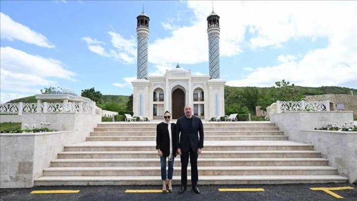 Zengilan'da yeni inşa edilen caminin de açılışını yapan Aliyev ve eşi, camideki Kur'an-ı Kerim'i öptü ve dua etti.