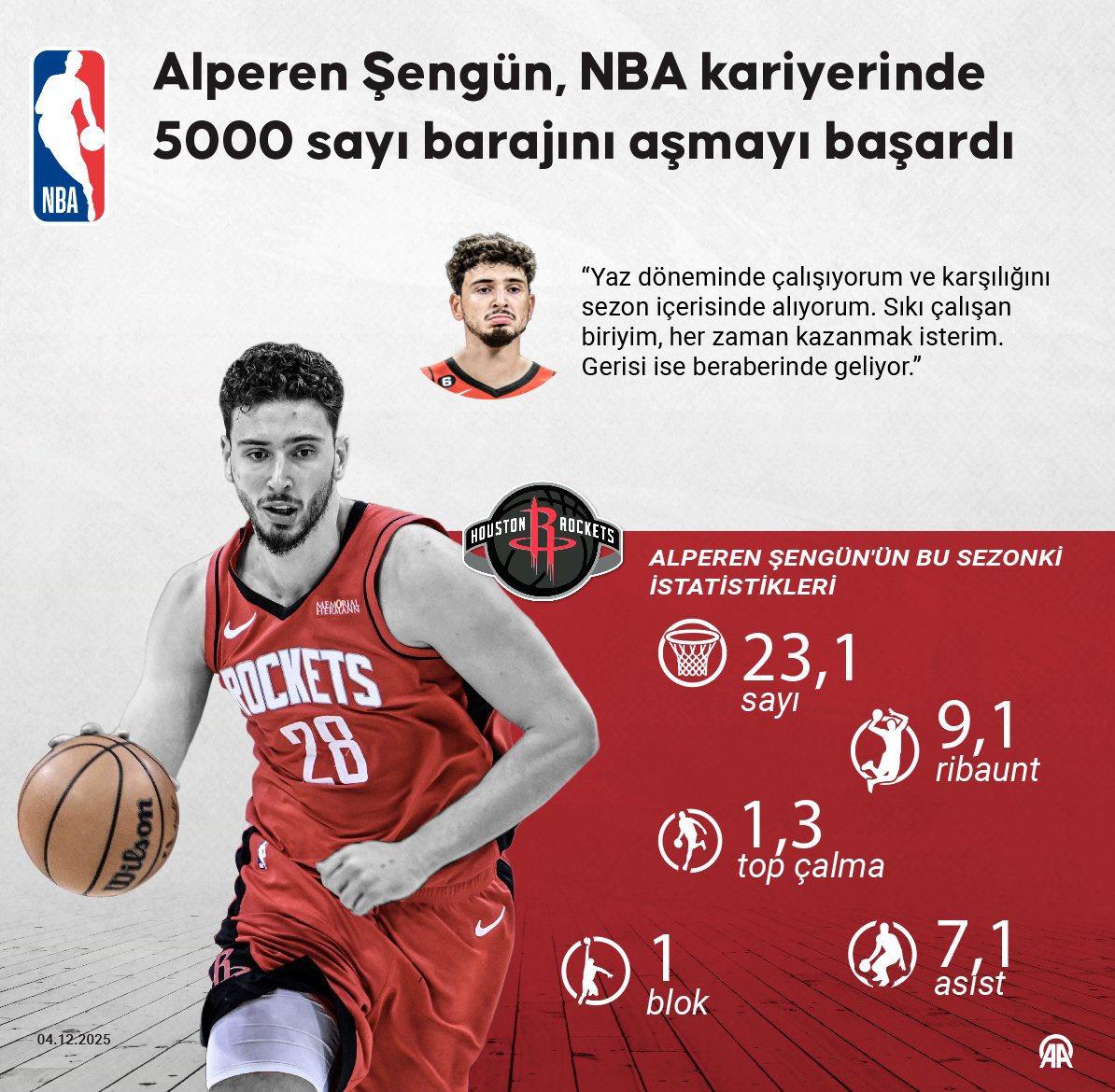 Toyota Center'da oynanan karşılaşmada, milli oyuncu Alperen Şengün 28 sayı ve 10 ribauntla "double-double" yaptı ve müsabakanın en skorer oyuncusu oldu. 23 yaşındaki yıldız, ayrıca NBA kariyerinde 5 bin sayı barajını da aşarak adını efsanelerin arasına yazdırdı.