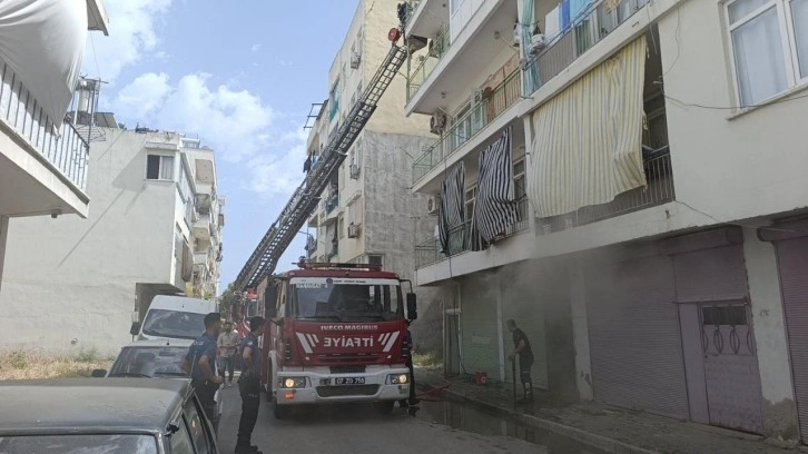 İtfaiye görevlileri yangına müdahale ederken, merdivenli itfaiye yardımıyla üst katlarda mahsur kalan vatandaşlar aşağıya indirildi.
