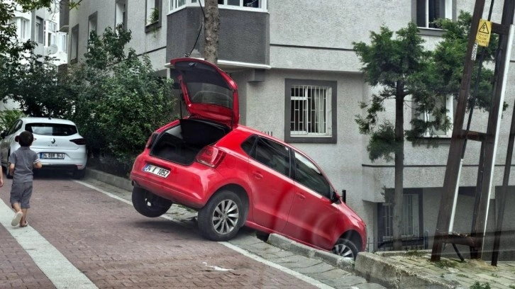 Olay, Gümüşpala Mahallesi’nde meydana geldi. Yolda ilerleyen sürücü çıkmaz yolda olduğunu fark edince, manevra yaparak dönüş yapmaya çalıştı. İki bina arasındaki boşluğu yol zanneden sürücü, direksiyonu kırınca otomobil merdivenlerde asılı kaldı.