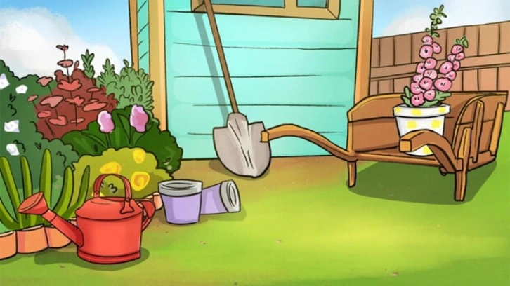 Yukarıdaki resimde bir bahçe, bahçe malzemeleri ve ekilmeyi bekleyen çiçekler olduğunu görüyorsunuz. İlk bakışta her şeyin normal ve doğru olduğunu görüyorsunuz. Ancak bu bahçe resminde bir mantık hatası var ve sizden bunu 10 saniye içerisinde bulmanızı istiyoruz.