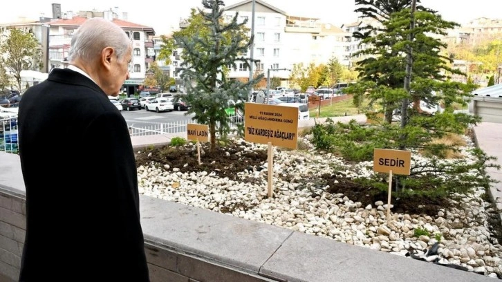MHP, sosyal medya platformu X hesabından Devlet Bahçeli’nin genel merkez önüne diktiği göknar, sedir, ladin ağaçlarının önünde çekilmiş fotoğraflarını paylaştı.