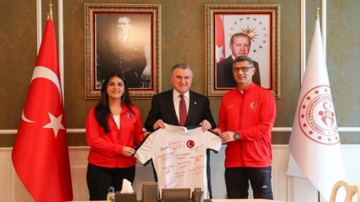 Ziyaretin ardından milli sporcular, Bakan Bak'a üzerinde imzalarının bulunduğu milli takım forması hediye etti.