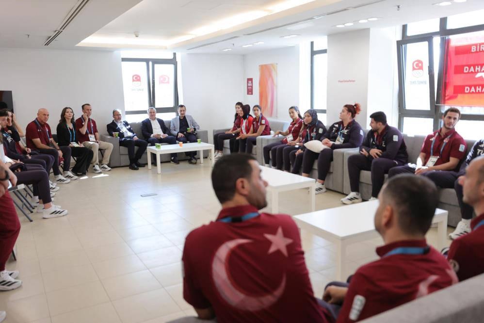 Milli sporcularla sohbet ederek durumları hakkında bilgi alan Bakan Bak, ay-yıldızlılara 6. İslami Dayanışma Oyunları'nda başarılar diledi.
