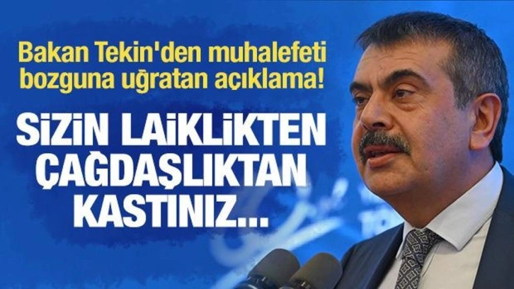 Bakan Tekin, dünyada olduğu gibi Türkiye'de de milli duygular ve manevi değerleri öğretmek için çabaladıklarını söyledi. Tekin, "Ben bu ülkeye çocuklarımız gönül bağı ile bağlı olsun istiyorum. Dolayısıyla milli değerleri çocuğa vermek istiyorum, buna mı karşı çıkıyorsunuz? Çocuğa; hak, adalet, hukuk devleti, insan hakları, merhamet, vatanseverlik bunları vermek istiyorum, buna mı karşı çıkıyorsunuz o zaman?" dedi.