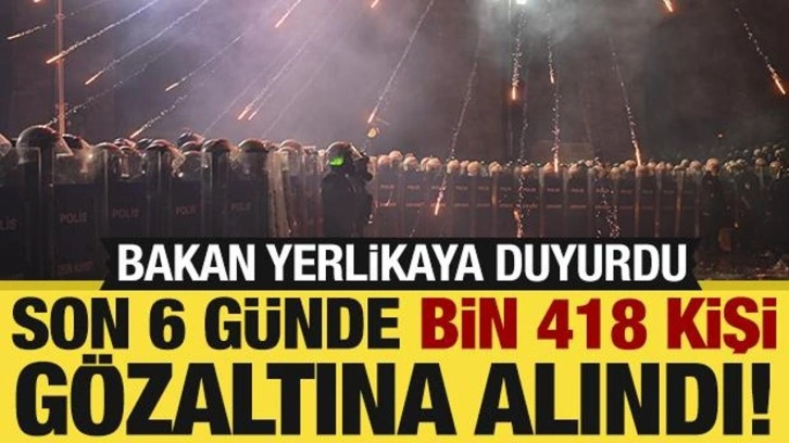 Yerlikaya açıklamasında; son 6 günde yasa dışı gösterilere katılan bin 418 kişinin gözaltına alındığını, halen gözaltında bulunan 478 şahsın ise bugün adli makamlara çıkartılacağını kaydetti.
