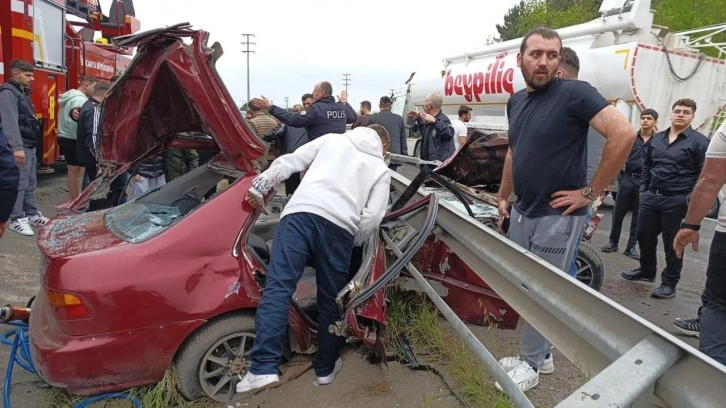 Kazada, bariyerin altına girip hurdaya dönen araçta sıkışan sürücü S.A. ile yanındaki S.G. yaralandı. İhbar üzerine kaza yerine itfaiye, polis ve sağlık ekipleri sevk edildi.