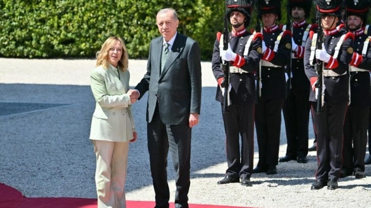 Erdoğan ve Meloni, tören kıtasının selamlanmasının ardından tokalaşarak basın mensuplarına poz verdi.