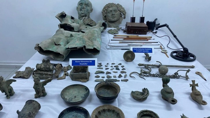 Operasyon kapsamında adreslerde ve araçlarda yapılan aramalar sonucunda Ortaçağ, Demir Çağı ve Roma dönemine ait 156 heykel, heykelcik ve çeşitli objeler ile tarihi eser aramada kullanılan detektörler ele geçirildi.