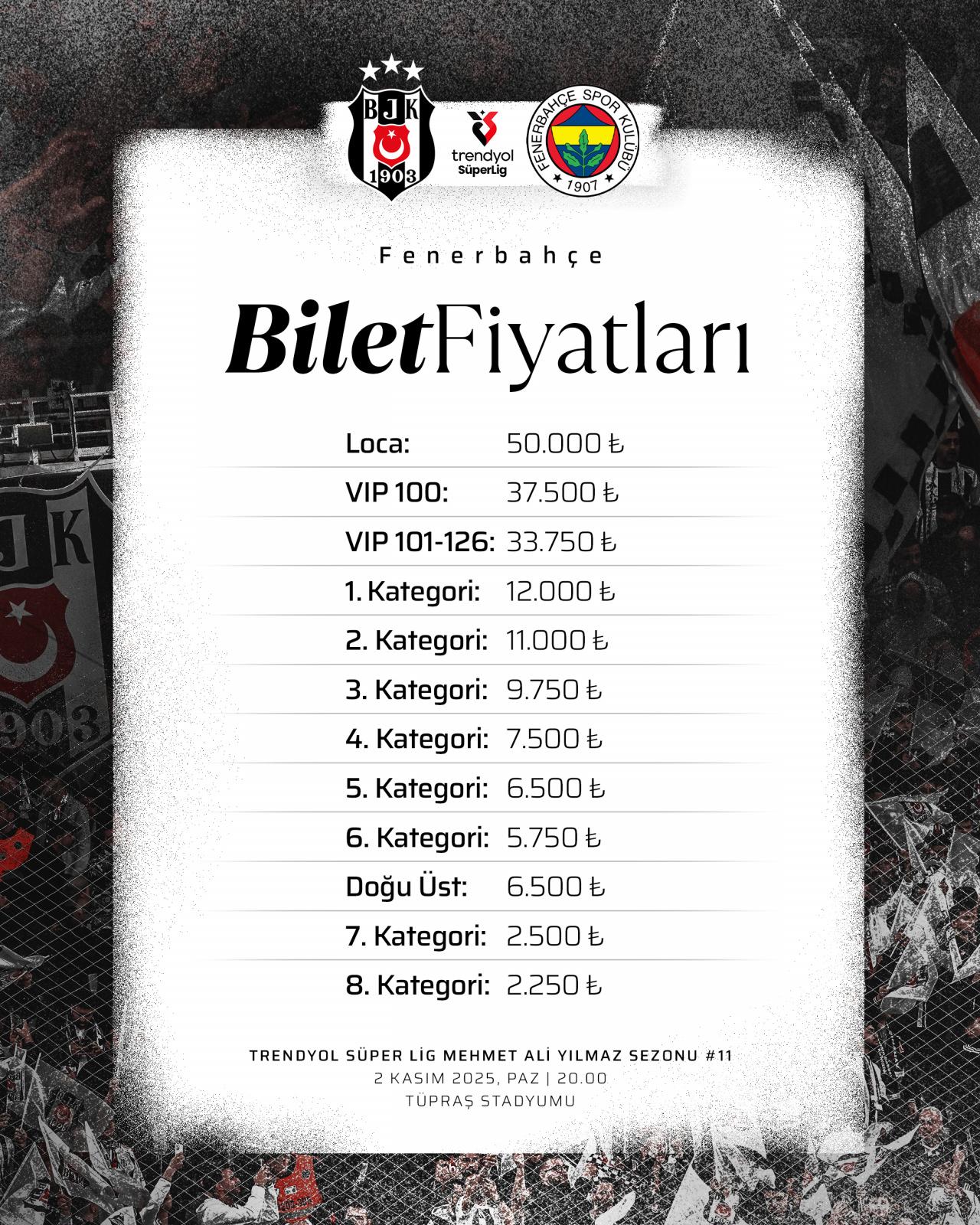 Bilet fiyatları 2 bin 250 lira ile 50 bin lira arasında değişecek. 50 bin liralık loca bileti alan taraftarlara müsabakanın ardından futbolcuların imzalayacağı Beşiktaş forması hediye edilecek.