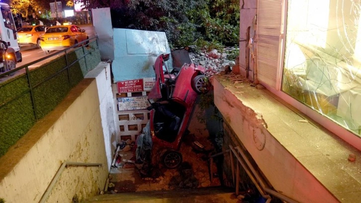 İstanbul Beşiktaş'ta Büyükdere Caddesi Levent mevkisinde sürücüsünün direksiyon hakimiyetini kaybettiği 34 FLB 848 plakalı otomobil, kaldırıma çarpıp bir bankanın merdiven boşluğuna düştü.