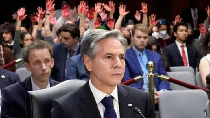 Blinken konuşmasına devam etmeye çalışırken, ikinci bir protestocu aynı şekilde konuşmasını bölerek, “Sonsuza dek 'Kanlı Blinken' olarak anılacaksınız. Siz acımasız bir savaş suçlususunuz” ifadelerini kullandı.