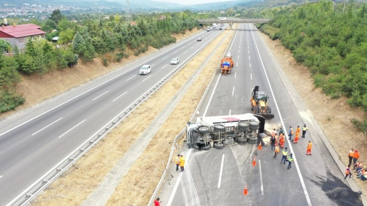 Otoyolun İstanbul istikameti 1. viyadük mevkisinde, plakası ve sürücüsünün ismi öğrenilemeyen asfalt yüklü kamyon devrildi.