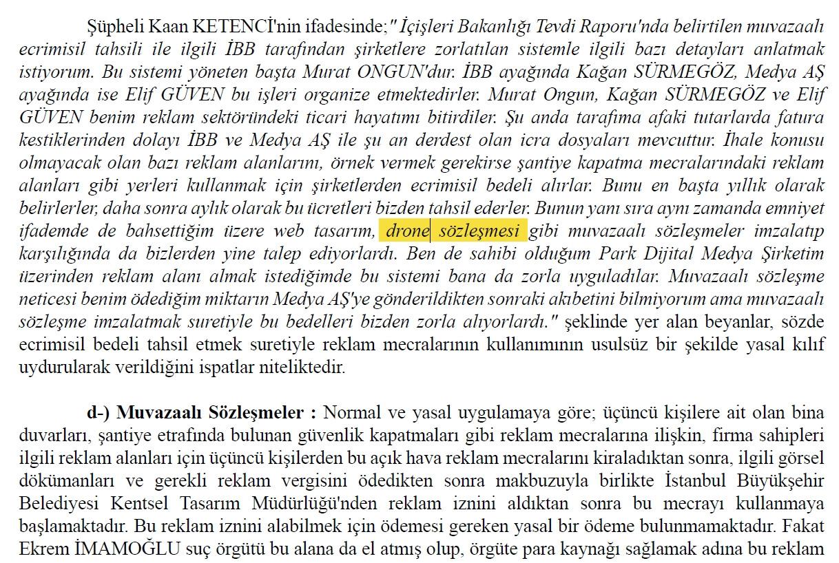 “İçişleri Bakanlığı Teftiş Raporu’nda belirtilen muvazaalı ecrimisil tahsili ile ilgili İBB tarafından şirketlere zorlatılan sistemle ilgili bazı detayları anlatmak istiyorum. Bu sistemi yöneten başta Murat Ongun’dur. /.../ İhale konusu olmayacak olan bazı reklam alanlarının -örnek vermek gerekirse şantiye kapatma mecralarındaki reklam alanları gibi yerlerin- kullanımı için şirketlerden ecrimisil bedeli alırlar. Bunu en başta yıllık olarak belirlerler, daha sonra aylık olarak bu ücretleri bizden tahsil ederler. Bunun yanı sıra aynı zamanda emniyet ifademde de bahsettiğim üzere web tasarım, drone sözleşmesi gibi muvazaalı sözleşmeler imzalatıp karşılığında da bizlerden yine talep ediyorlardı.”
