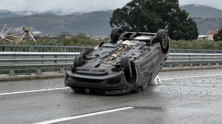 Bursa'nın Yenişehir çevre yolunda, dün öğle saatlerinde İznik yönüne seyir halinde olan Vural Y. yönetimindeki otomobil, yağış nedeniyle oluşan su birikintisine girdi. Sürücüsünün direksiyon hakimiyetini kaybettiği otomobil, refüje çarpıp takla atarak yaklaşık 100 metre sürüklendi.