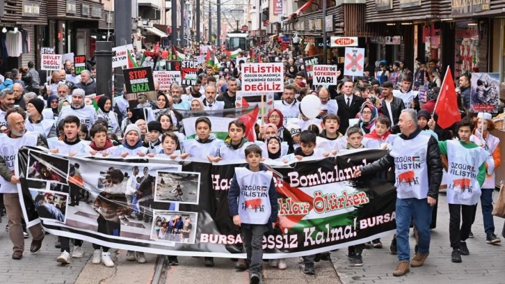 Daha sonra hem Tophane Meydanı hem Setbaşı Köprüsü’nden harekete geçen çocuklar Ahmet Vefik Paşa Tiyatrosu önünde toplanıp, Filistin’e özgürlük yürüyüşü başlattı. İnönü ve Cumhuriyet Caddesi üzerinden 15 Temmuz Demokrasi Meydanı’na kadar sloganlarla yürüyen çocuklara Bursa Büyükşehir Belediye Başkanı Alinur Aktaş ve Gönüllü Kuruluşlar Platformunu oluşturan kuruluşların yöneticileri de eşlik etti.