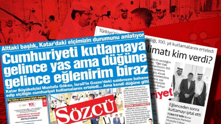 Katar’da 27-29 Ekim’de yapılması planlanan Cumhuriyet’in ilan edilişinin yıldönümüne ilişkin resepsiyonların Gazze’deki insanlık dramı dolayısıyla 23-24 Kasım’a ertelenmesini art niyetle yorumlayan gazeteler “düğün” algısı üzerinden Büyükelçi Göksu’yu hedef aldı.