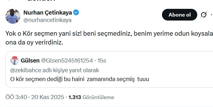 CHP’li bir takipçisinin “O kör seçmen dediği bu zamanında seçmiş” eleştirisine de farklı bir paylaşımında cevap veren Çetinkaya, “Yok o kör seçmen yani siz beni seçmediniz, benim yerime odun koysalar ona da oy verirdiniz.” dedi.