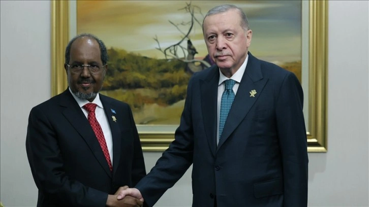 Cumhurbaşkanı Erdoğan, Somalili mevkidaşını Cumhurbaşkanlığı Külliyesi'ne gelişinde giriş kapısında karşıladı.