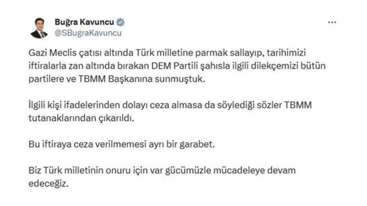 İYİ Parti Grup Başkanvekili Buğra Kavuncu, sosyal medya hesabından yaptığı paylaşımda, "Gazi Meclis çatısı altında Türk milletine parmak sallayıp, tarihimizi iftiralarla zan altında bırakan DEM Partili şahısla ilgili dilekçemizi bütün partilere ve TBMM Başkanına sunmuştuk. İlgili kişi ifadelerinden dolayı ceza almasa da söylediği sözler TBMM tutanaklarından çıkarıldı. Bu iftiraya ceza verilmemesi ayrı bir garabet. Biz Türk milletinin onuru için var gücümüzle mücadeleye devam edeceğiz" ifadelerini kullandı.