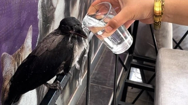 Şahin, burada kargaya su bardağından su içirdi. Karga, üzerine dökülen suyla da serinledi. Bu arada karganın su içmesi cep telefonu kamerasıyla kaydedildi.
