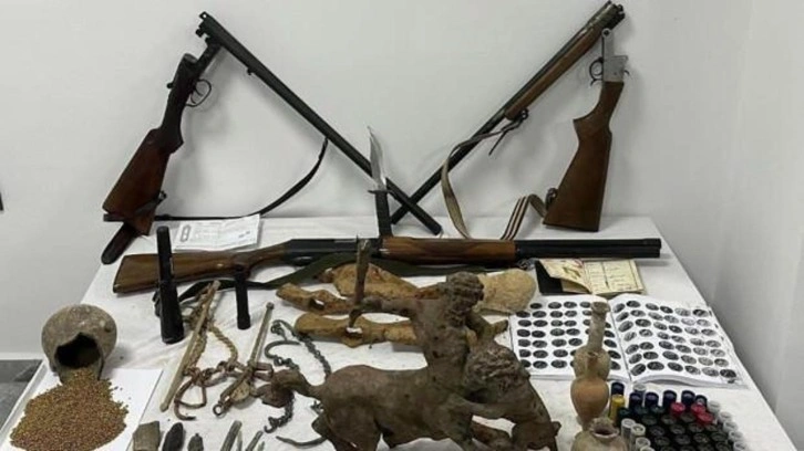 Evlerde yapılan aramalarda; Bizans Dönemi'ne ait 4 sikke, 6 tarım aleti, 2 terazi, Bizans ve Tunç çağlarına ait 2 testi, Roma Dönemi'ne ait 1 gözyaşı şişesi ve 8 süs eşyası, 3 kandil ile 1 dedektör, ruhsatsız 3 tüfek ve 70 av tüfeği fişeği ele geçirildi.