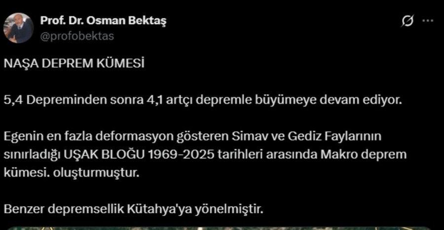Öte yandan Prof. Dr. Bektaş, "Benzer depremsellik Kütahya'ya yönelmiştir" diyerek benzer sürecin Kütahya yönüne doğru kaydığına dikkat çekerek, bölgedeki diğer yerleşimlerin de risk altında olduğuna vurgu yaptı.