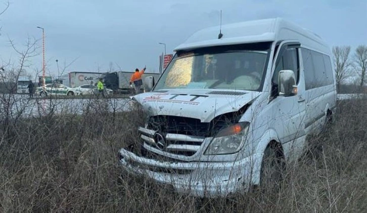 Çarpışmanın etkisiyle yol kenarına savrulan servis aracındaki 4 işçi yaralandı.
