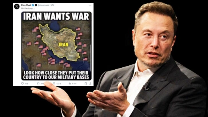 SpaceX, Tesla ve X'in sahibi milyarder iş insanı Elon Musk, sosyal medya hesabı X'ten yaptığı "Ah İranlılar..." paylaşımında, ""İran savaş istiyor. Bakın, ülkelerini bizim askeri üslerimize ne kadar yaklaştırmışlar." ifadelerinin yer aldığı bir görsel yayınladı.