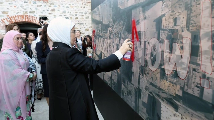Emine Erdoğan ile beraberindeki konuklar, daha sonra Cumhurbaşkanlığı İletişim Başkanlığınca Dolmabahçe Çalışma Ofisi'nde zirveye özel düzenlenen "Gazze: Direnen İnsanlık" isimli sergiye ziyarette bulundu.