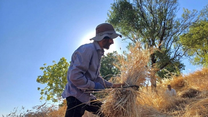 Günün ilk ışıklarıyla tarlalarının yolunu tutan üreticiler, sıcak havanın etkili olduğu bölgede oraklarla buğday başaklarını keserek hasat ediyor, kesilen başakları iple bağlayarak eşeklerle köye yakın boş bir araziye taşıyorlar.