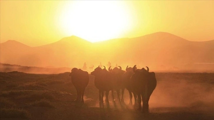 Öte yandan Hürmetçi Sazlığı'nda yayılan ve sayıları 6 bini bulan mandalar, tozlu yollardan geçip, gün batımında ferahlamak için girdikleri suda serinledikten sonra sahiplerince ahırlara götürülüyor.