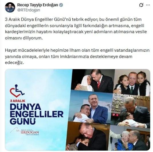 Cumhurbaşkanı Erdoğan, paylaşımında şu ifadeleri kullandı: "Bu önemli günün tüm dünyadaki engellilerin sorunlarıyla ilgili farkındalığın artmasına, engelli kardeşlerimizin hayatını kolaylaştıracak yeni adımların atılmasına vesile olmasını diliyorum. Hayat mücadeleleriyle hepimize ilham olan tüm engelli vatandaşlarımızın yanında olmaya, onları tüm imkânlarımızla desteklemeye devam edeceğiz."