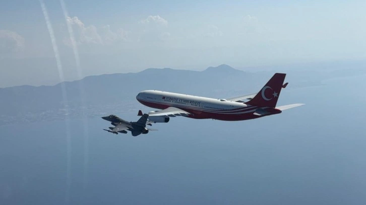 Cumhurbaşkanı Erdoğan'ı taşıyan TUR uçağına, Ercan Havalimanı'na inişinden önce F-16'lar da eşlik etti.