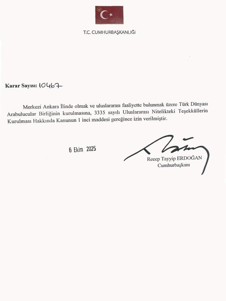 Türkiye Cumhuriyeti Cumhurbaşkanı Recep Tayyip Erdoğan, 6 Ekim 2025 tarihli ve 10467 sayılı Kararnameyi imzalayarak, merkezi Ankara'da olmak üzere Türk Dünyası Arabulucular Birliği'nin kurulmasına ve 3335 sayılı Uluslararası Örgütler Teşkilatı Kanunu'nun 1. maddesi uyarınca uluslararası düzeyde faaliyet göstermesine yetki vermiştir.