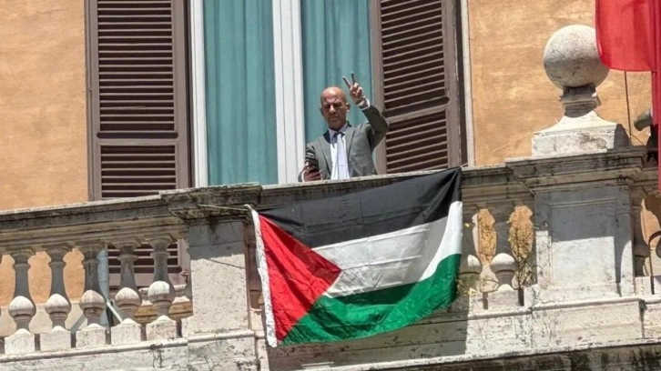 Yeşiller Partisinden 1992-1994 yıllarında milletvekilliği yapan ve halihazırda gelecek ay yapılacak Avrupa Parlamentosu (AP) seçimleri için Yeşiller ve Sol İttifaktan aday olan 58 yaşındaki Apuzzo, Roma'da Temsilciler Meclisi'nin bulunduğu Montecitorio Sarayı'nın ön cephesindeki pencerelerden balkona çıkarak, buraya iki Filistin bayrağı astı.