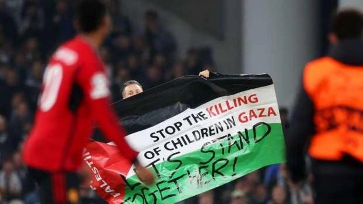Maçın başında sahaya giren taraftarın elinde tuttuğu bayrakta, "Gazze'de çocukların öldürülmesini durdurun! Birlik olalım." yazısı olduğu görüldü.