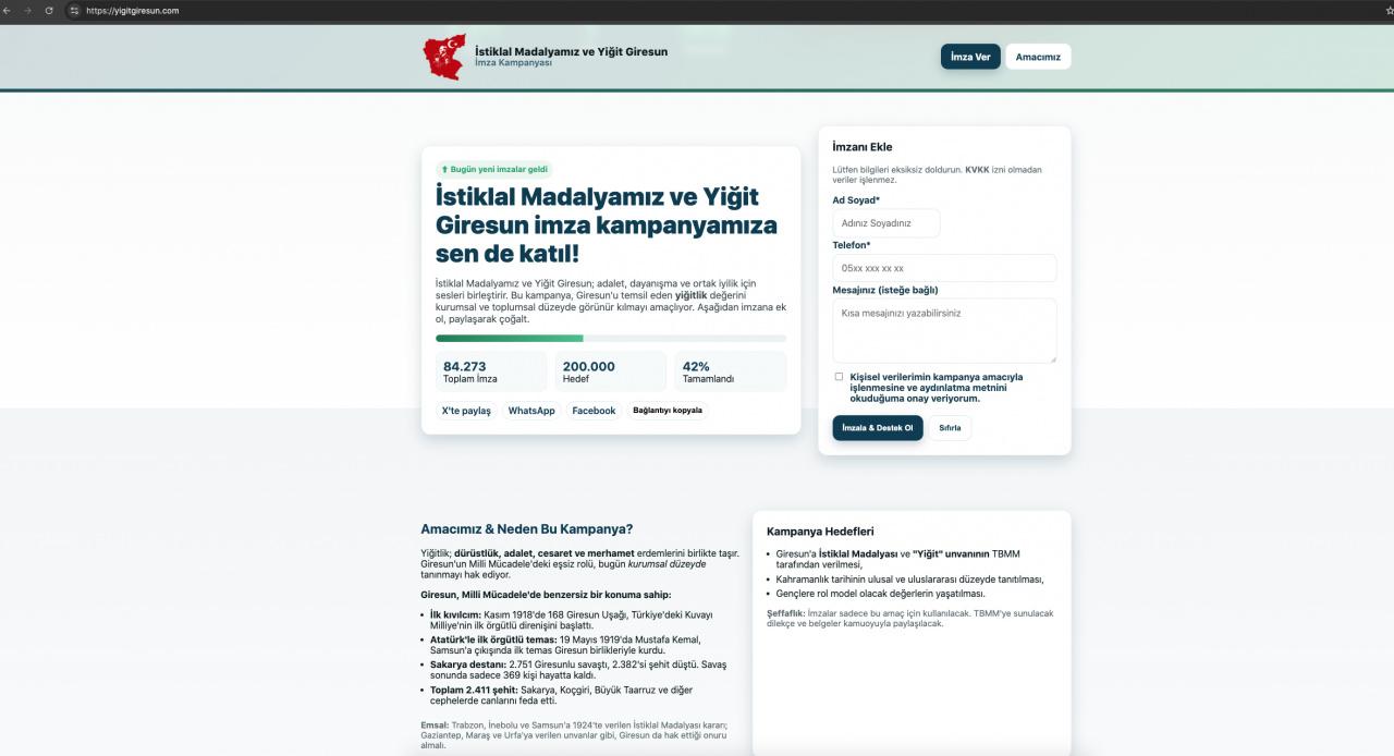 Kampanya, Giresun’a İstiklal Madalyası verilmesi ve “Yiğit” unvanının resmen tanınması için Türkiye Büyük Millet Meclisi'ne (TBMM) sunulacak. 31 Ekim 2025 saat 12:00'ye kadar 84 binden fazla kişi kampanyayı imzalarken, hedef 200 bin imza olarak belirlendi. Kampanyada Giresun’un, Kurtuluş Savaşı’nda verdiği mücadeleye dikkat çekildi.