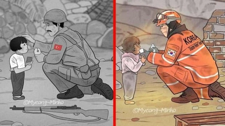 Söz konusu çizimin bir yarısında Ayla bebeğe yiyecek uzatan Türk askeri yer alırken, diğer yarısında enkaz altından kurtardığı Türk çocuğuna yiyecek uzatan bir Güney Koreli arama kurtarma ekibi üyesi görülüyor.