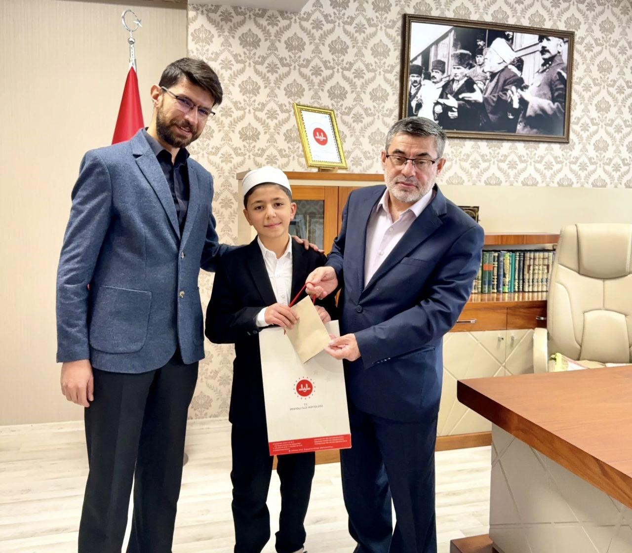 İpekyolu İlçe Müftüsü Fatih Tavlaşoğlu, Kur'an kursu yöneticisi, hocası ile hafız Yurdakul'u makamında ağırladı.